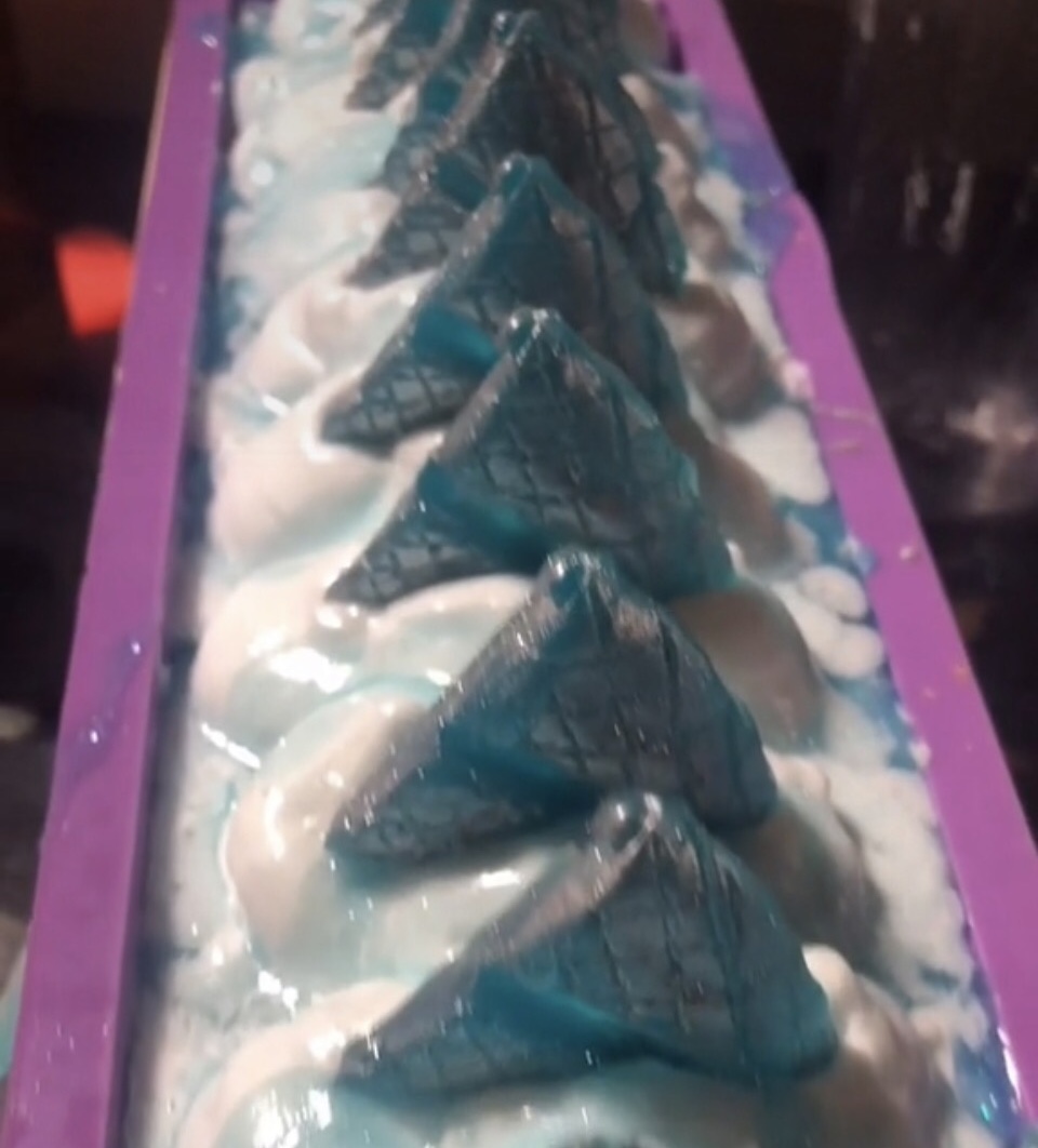 Top: pearl (mica) Whipped soap, ice water (clear soap with GID light blue pigment) thick drizzle.